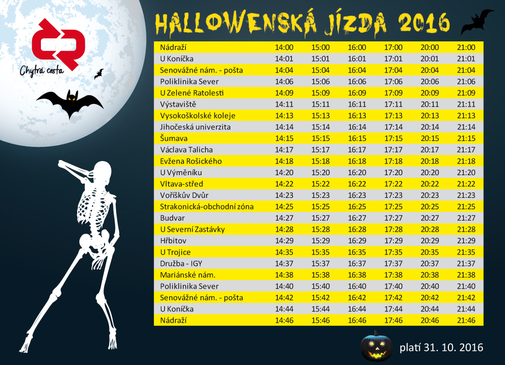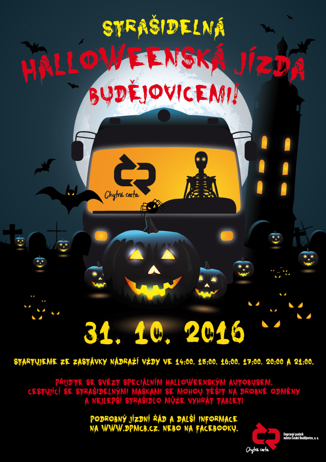 Již potřetí přichystal Dopravní podnik města České Budějovice, a.s. pro všechny zájemce oslavu Halloweenu. Jízdy speciálně vyzdobeného vozu v krajském městě proběhnou přesně v den svátku, tedy v pondělí 31. 10. 2016, a opět slibují výjimečný zážitek. Odpolední spoje jsou určeny hlavně pro děti, večerní pak pro dospělé. Pasažéři, kteří do vozu nastoupí v maskách, se mohou těšit na drobné odměny od strašidelných průvodčích.