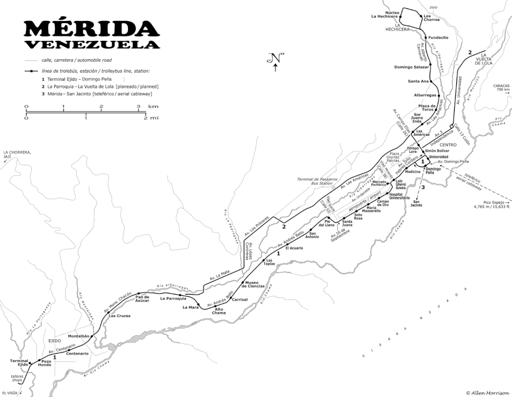 Základní síť měla od počátku sestávat ze dvou trolejbusových tratí segregovaných od okolního uličního provozu, které se potáhnou kolem obou břehů řeky Albarregas a potkají se v centru, kde budou sdílet krátký úsek a kde se zároveň překříží, a k tomu měla být ještě vystavěna lanovka z centra Méridy do obydlené lokality San Jacinto, jež je položena o několik set metrů níže. Již nyní můžeme uvést, že lanovku s komerčním názvem Trolcable mající délku sotva 0,5 km a hodinovou kapacitu cca 12 000 cestujících se otevřít podařilo, a to roku 2012, přičemž je považována za součást tamního systému masivní dopravy, načež byla opatřena číslem 3 (linky č. 1 a 2 byly vyhrazeny trolejbusům). Hlavním dodavatelem nové lanové dráhy byla společnost Doppelmayr, která stála i v čele modernizace výše zmíněné lanovky.