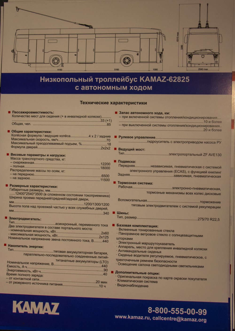 Ruský výrobce KAMAZ představil v tomto týdnu na veletrhu Busworld Russia konaném v Krasnogorsku v areálu Crocus Expo trolejbus, který možno označit jako parciální. Je to vůbec poprvé, co trolejbus tento známý producent vyrobil. O něco zajímavější je ještě fakt, že právě KAMAZ dodává do Moskvy elektrobusy typu KAMAZ-6282, které se v provozu zatím neosvědčily a z nichž byl právě nový trolejbus nesoucí podobné označení KAMAZ-62825 odvozen.