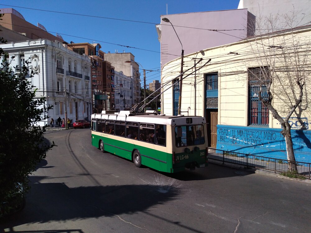 Trolejbusy začaly jezdit ve Valparaísu ležícím u pobřeží Tichého oceánu poslední den roku 1952. Valparaíso je městem postaveným z velké části na strmých kopcích, které byly přístupné většinou s pomocí náročných schodišť a později i více než třemi desítkami lanovek, příp. výtahů. Silnic směřujících do kopců existovalo malé množství, a stavěné trolejbusové tratě tak byly soustředěny převážně do osídlené nekopcovité centrální části u samotného pobřeží, přičemž jedna z těchto tratí byla vedena podél pobřeží do sousedního města Viña del Mar, kde se dále větvila, a pouze jedna trať dávala trolejbusům z hlediska sklonových poměrů skutečně zabrat.