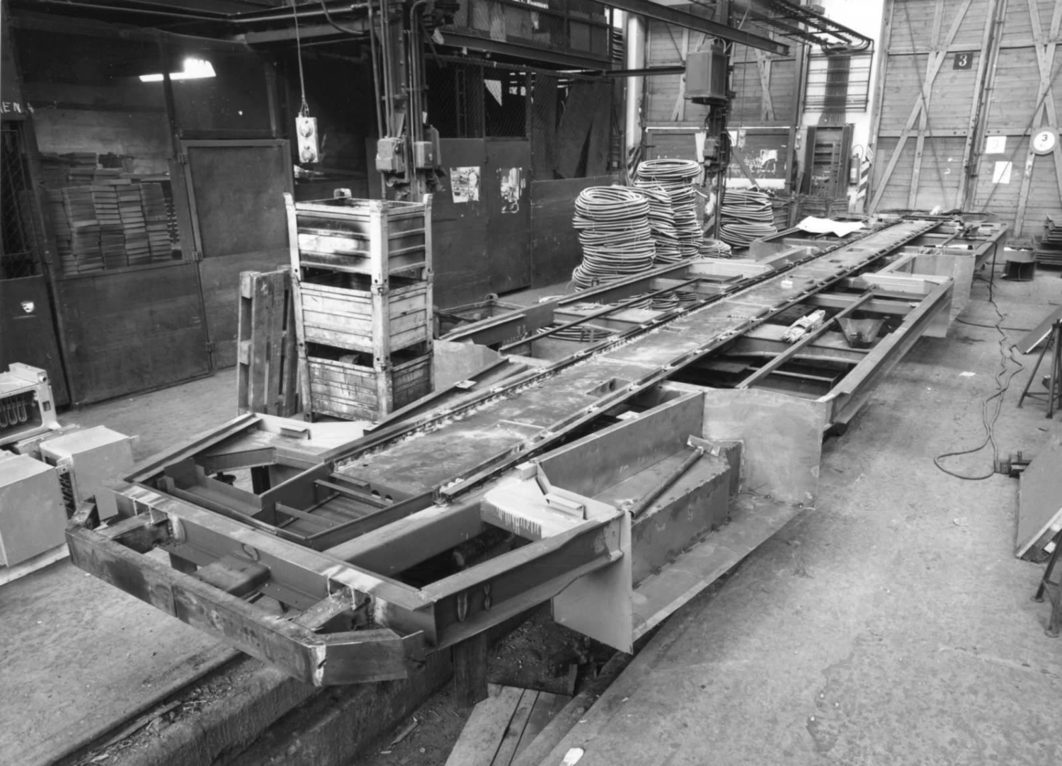 Základní rám jednoho z prototypů tramvaje T5C5. Ze snímku je dobře patrné, že s ohledem na oboustranné provedení a délku vozu pod vozem příliš místa na elektrickou výzbroj nezbývalo. (foto: ČKD Tatra)