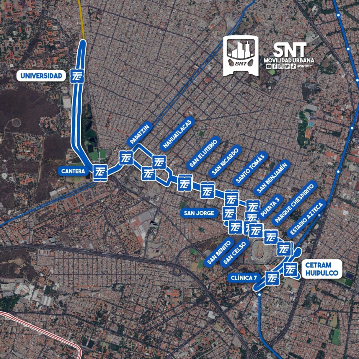Trať Ciudad Universitaria – Estadio Azteca bude v jednom směru měřit okolo 6,5 km, při započtení obou stop se bude jednat o zhruba 13,1 km. O tom, kolik procent trati bude zatrolejováno, se nelze dočíst. Dokončení trati musí proběhnout už do konce března 2026, aby se mohla rychle odzkoušet a zprovoznit, protože cílem jejího zřízení je zlepšit dopravu na největší fotbalový stadion země, Estadio Banorte (známý také jako „Estadio Azteca“), který má kapacitu více než 80 tisíc diváků a na kterém se příští rok odehraje několik zápasů světového šampionátu ve fotbale. Návazný úsek do Chapultepecu bude mít délku asi 11 km.