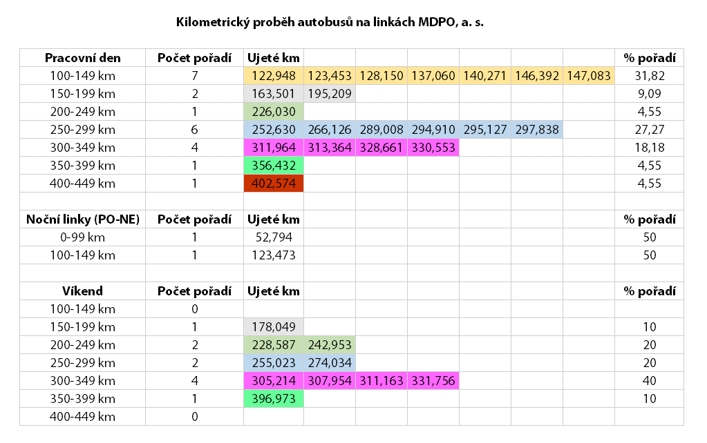 Zbylých 6 kurzů má nájezd nad 300 km, ve čtyřech případech (18,2 %) jde o oběh do 350 km, v jednom nad 350 km (4,55 %) a pouze jediný kurz na lince číslo 210 (4,55 %) zvládá během více než 19hodinové směny urazit mírně přes 400 km (kompletní přehled včetně víkendů a nočních linek uvádíme v tabulkovém přehledu). Sám MDPO přitom požaduje, jak jsme uvedli výše, jen deklaraci min. nájezdu 350 km při použití nabíjení z dvoupólového trolejového vedení, tj. nepřímo připouští, že linky s největším kilometrickým proběhem nemusí být elektrifikovány.
