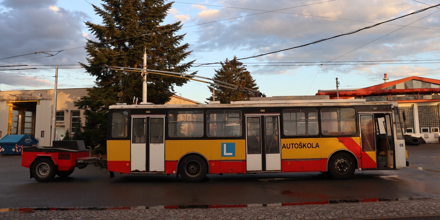 Souprava trolejbusu 14 Tr ev. č. 08 s dieselagregátem na přívěsném vozíčku ev. č. 60. Vozíček vyrobila královéhradecká pobočka Mechanice traťového hospodářství a jeho srdcem byl motor Zetor 1001, využívaný mj. v traktorech Zetor řady UŘ III. (foto: Adam Faltus)