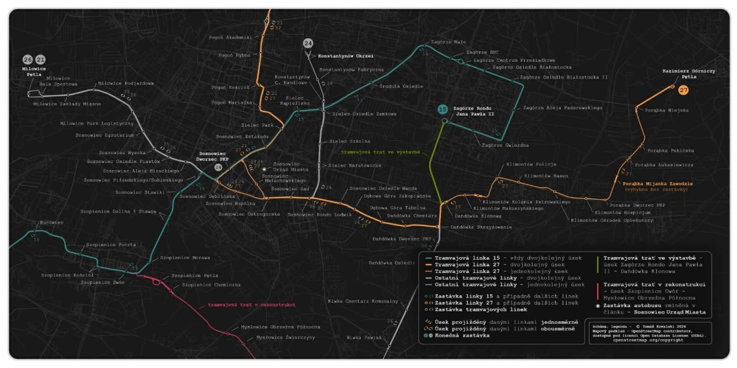Černé srdce Slezska, oblast Katowic a okolí, formované po staletí intenzivní těžbou uhlí a rozvojem těžkého průmyslu, v posledních desetiletích prochází výraznou proměnou. Zatímco bývalé těžební areály se mění v muzea, hustá síť tramvají stále tvoří jeden ze základních pilířů zdejší dopravní obslužnosti, pomyslnou spojnici mezi historickými průmyslovými areály a prosklenými výškovými budovami novodobých Katowic. Ačkoliv místní veřejná doprava v posledních letech prochází masivní modernizací, visel nad budoucností jedné z tramvajových tratí v uplynulých měsících pomyslný otazník. Počátkem letošního roku však došlo k rozhodnutí, že tato trať – vedená do městské části Kazimierz Górniczy – zůstane zachována, díky čemuž unikne smutnému osudu, který před lety potkal tramvajovou dopravu v Gliwicích, či v Rudzie Śląskiej.