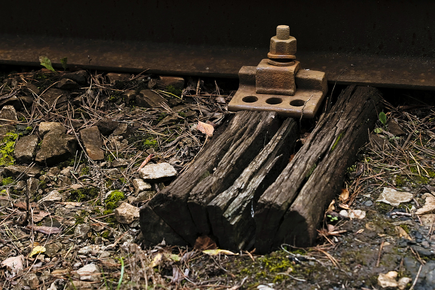 S výjimkou několika krátkých, v nedávné době opravených úseků je většina délky tratě uložena na dřevěných pražcích, které svádějí nepříliš úspěšný souboj se zubem času. (foto: Tomáš Kowalski)