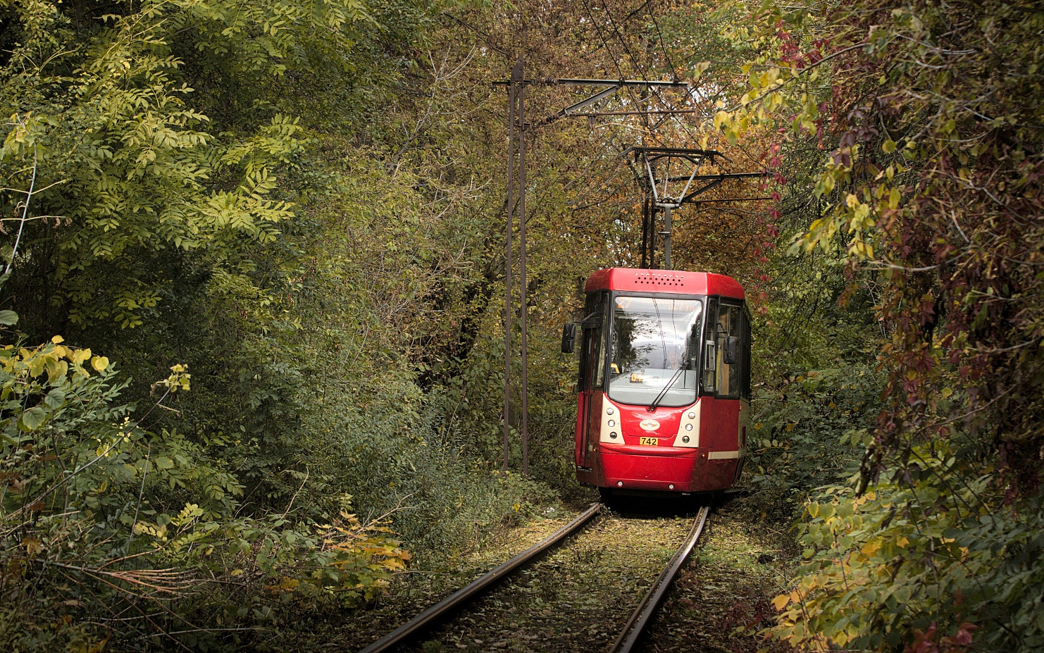 Tramvajová trať na Kazimierz Górniczy prochází hned několika malebnými úseky, na snímku se Konstal 105N-2K ev.č. 742 blíží k výhybně Klimontów Kolonia Pstrowskiego. (foto: Tomáš Kowalski)