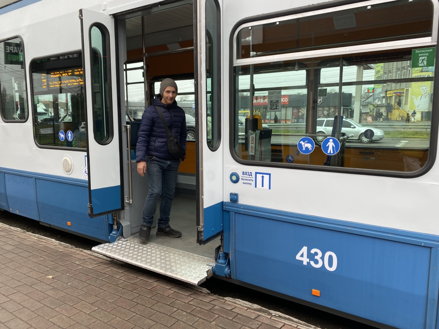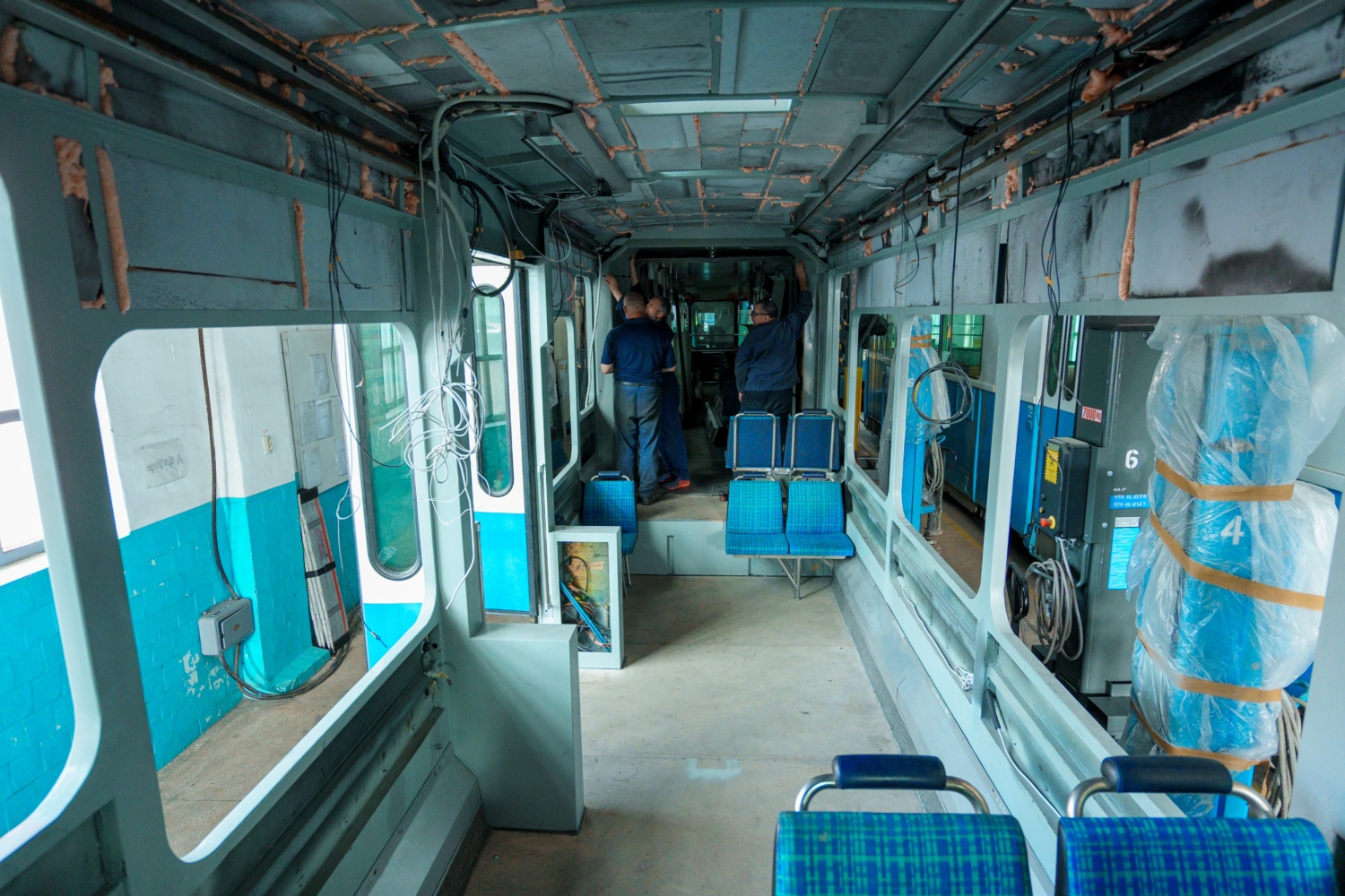 Okna, dveře, sedačky i dodatečný podvozek byly vytěženy z vozů Be 4/6 sloužících jako zdroj náhradních dílů. (foto: město Vinnycja)