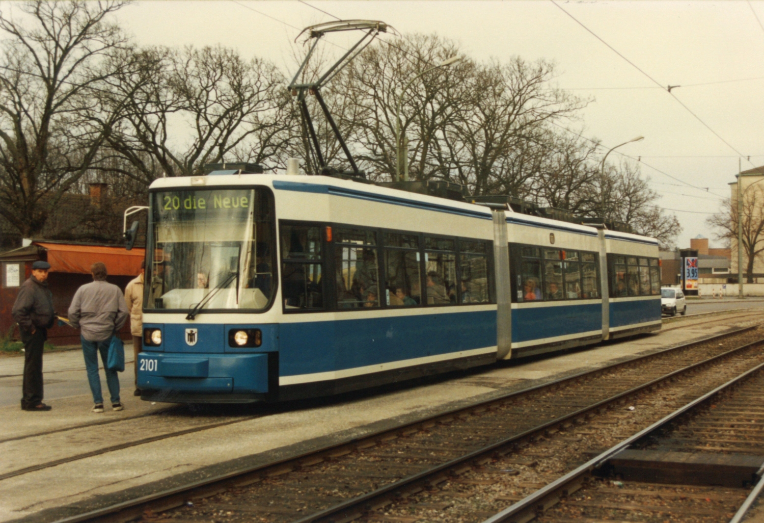 Stav vozu R2.2 ev. č. 2101 po dodání v roce 1994. Ačkoli se odstín modré na nemodernizovaných vozech později změnil, barevné schéma zůstalo zachováno. (foto: MVG)