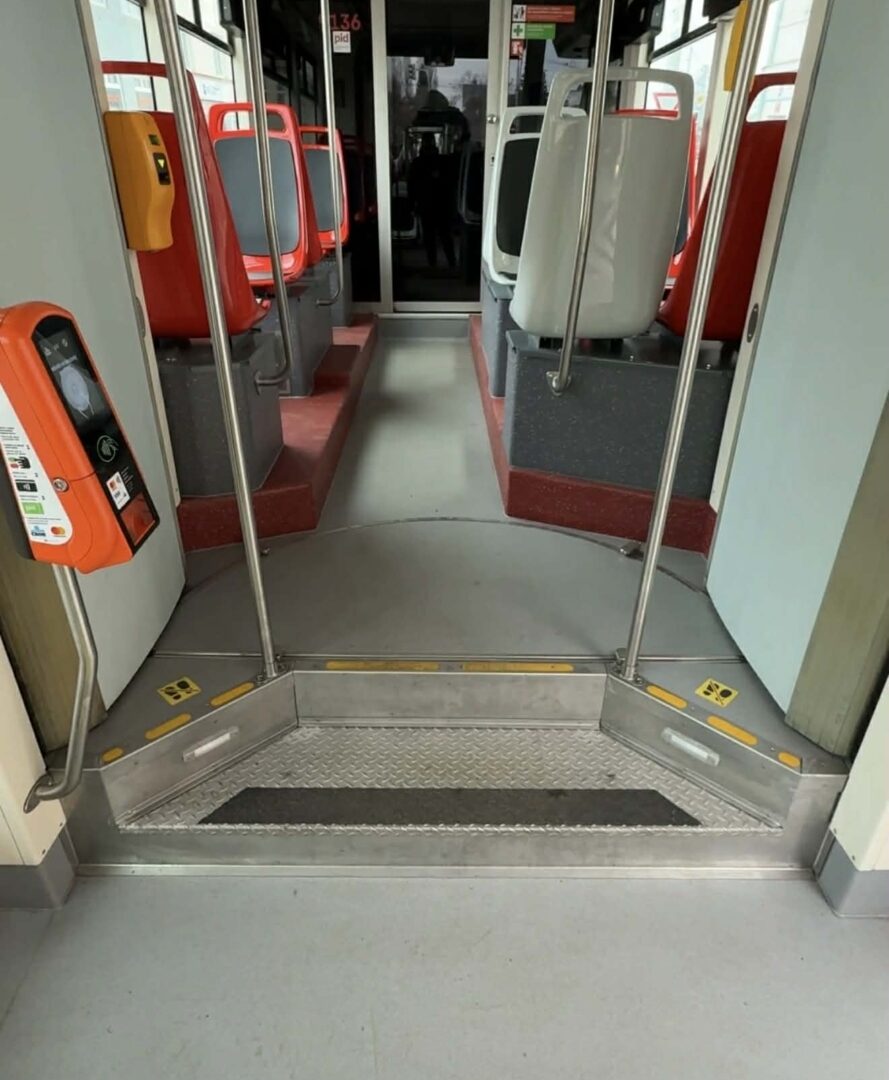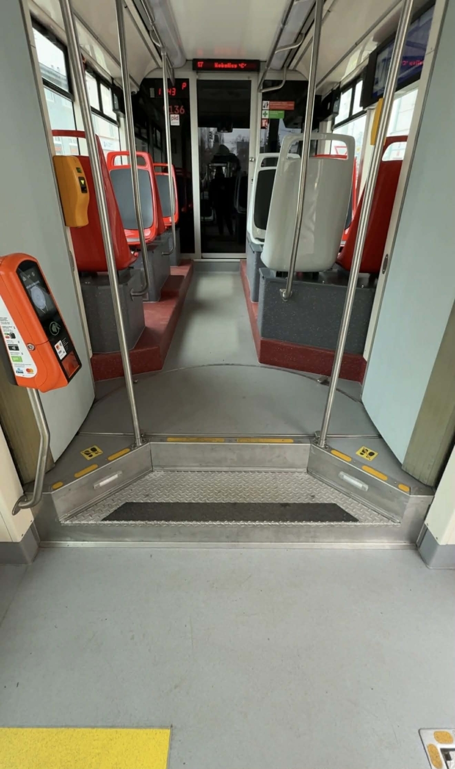 Pohled do upraveného interiéru s rozděleným výškovým stupněm na dva schůdky. Dva schůdky mají i příbuzné vozy Škoda 13T dodávané do Brna, u nichž šlo o úpravy z výroby na sérii dodávané od roku 2016. Brněnské provedení je však od toho pražského odlišné. (foto: Roman Hloch)
