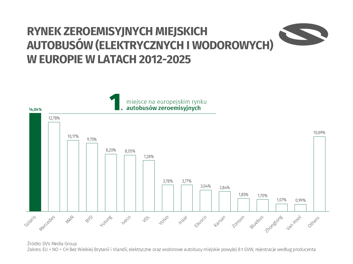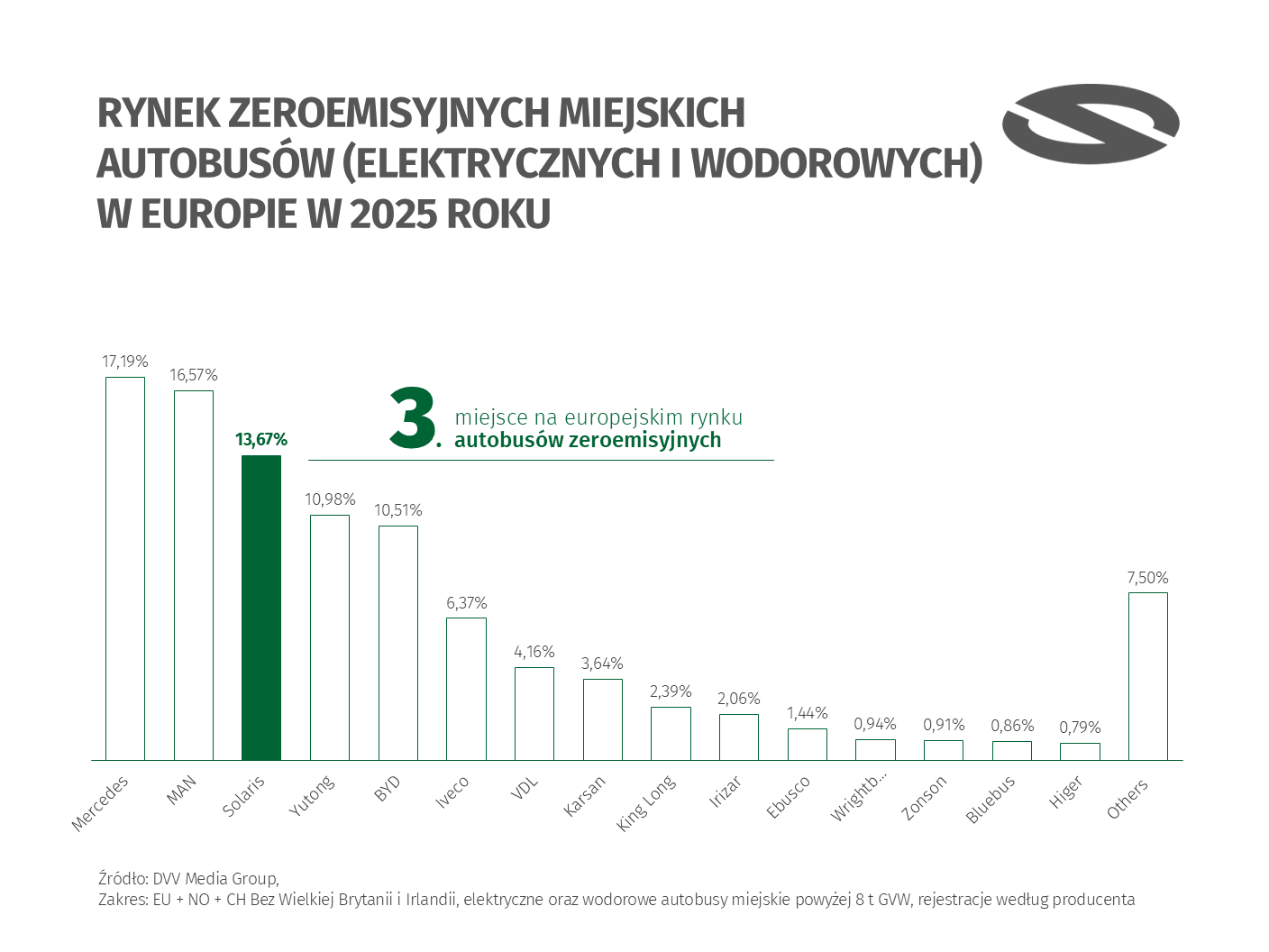 V prodejích nízkoemisních vozidel se Solaris staví na třetí příčku, bude-li počítáno pouze se zeměmi EU, Norskem a Švýcarskem a sečte-li vodíkové vozy i elektrobusy.