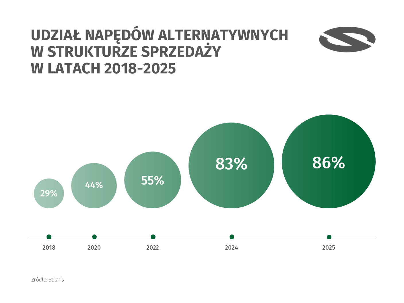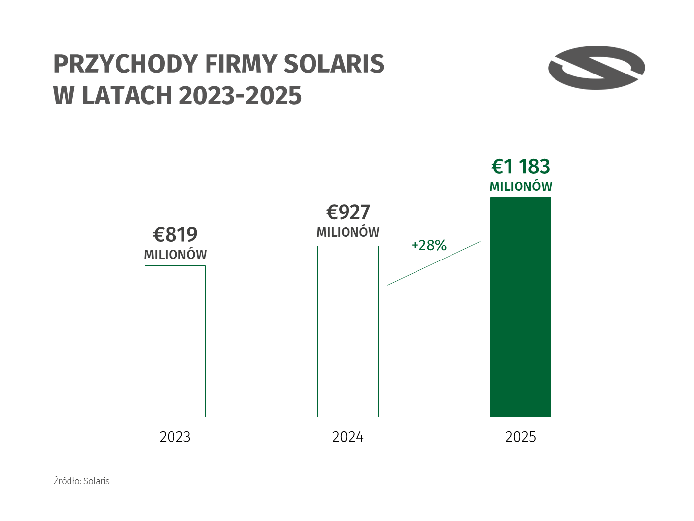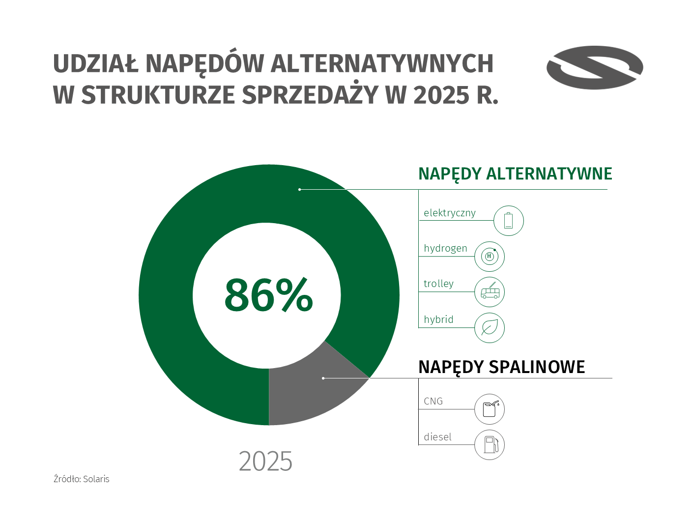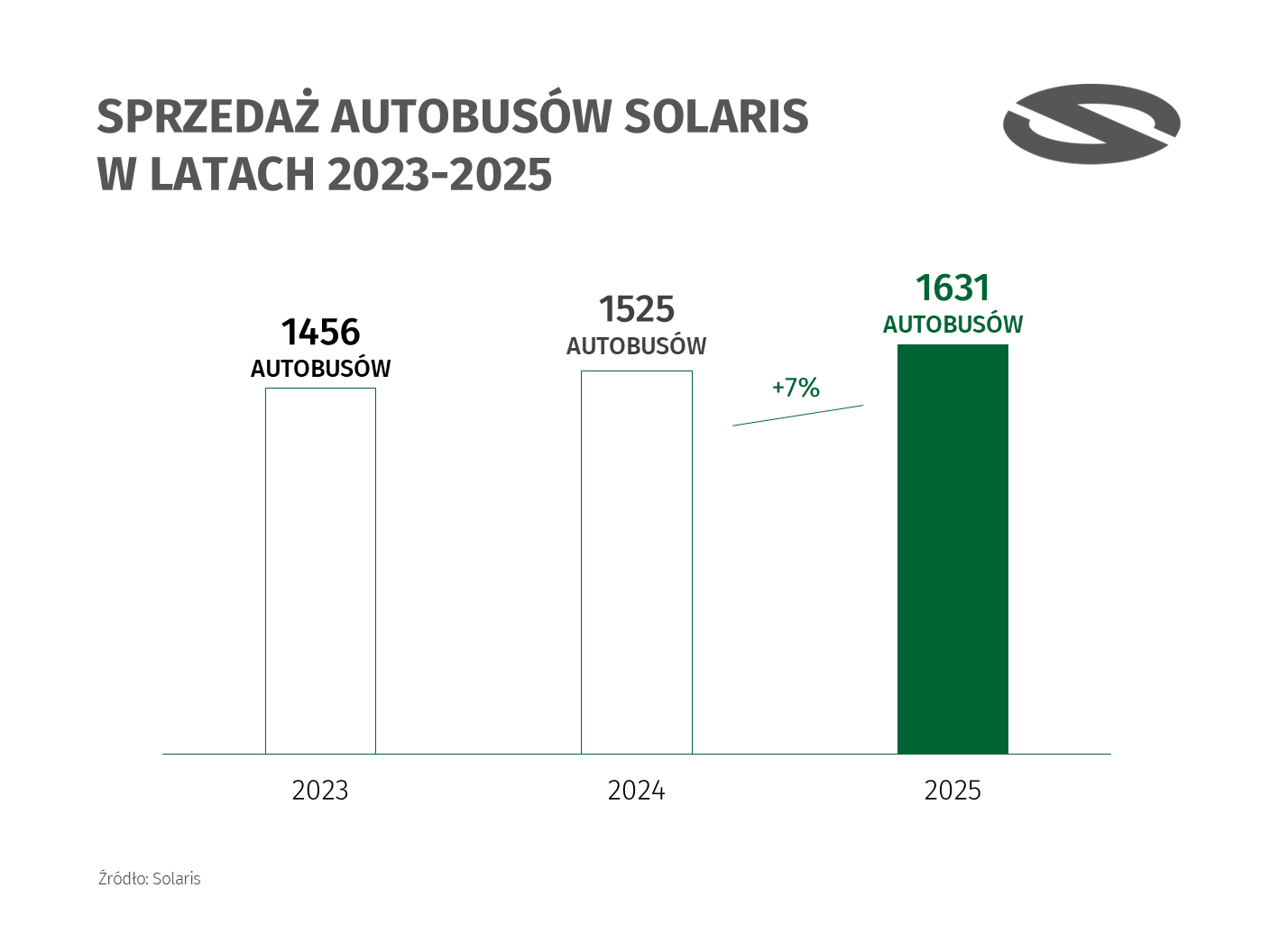 Zatímco v roce 2024 se podařilo Solarisu dodat 1 525 vozidel, v loňském roce šlo už o 1 631 kusů, jež nalezly uplatnění v 15 zemích. Mezi nimi měla největší podíl – 86 % – nízkoemisní a bezemisní vozidla, mezi něž Solaris počítá autobusy elektrické, vodíkové, trolejbusy, ale také hybridy. Solaris ovšem produkci klasických hybridních autobusů již ukončil a v současné době jako hybridní prezentuje vozy, které jsou ve skutečnosti vybaveny pouze mild-hybridním modulem, který má jen omezený dopad na úsporu paliva i emisí.