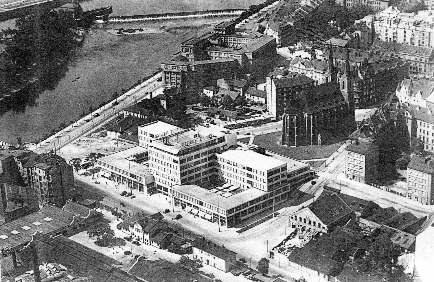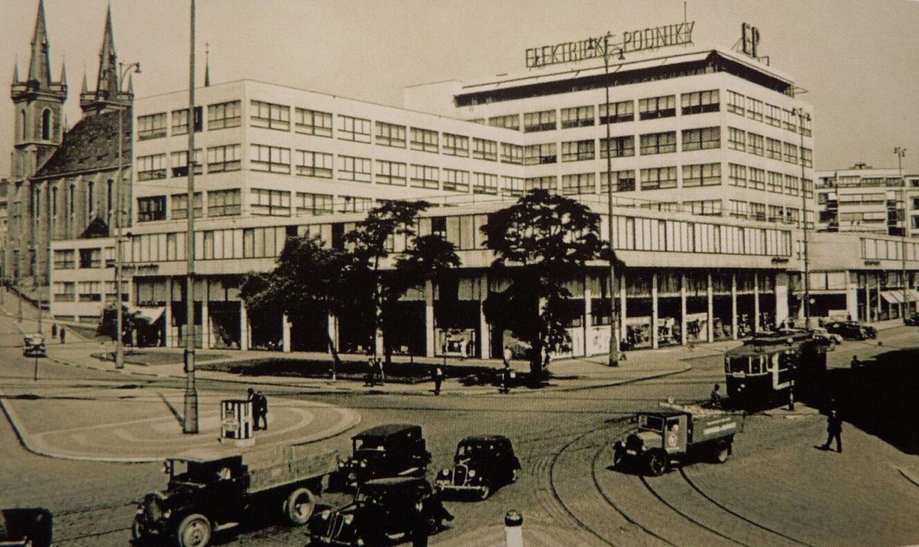 Letecký snímek s palácem Elektrických podniků z 30. let. Na snímku je dobře vidět odbočení z Bubenské ulice do Antonínské vybudované v roce 1932. Fotografie ukazuje ještě pozůstatky původních Buben, včetně hospodářského dvora (právě zde později vyrostly domy od architekta Gočára, jež dominují úvodní fotografii). Předmostí Hlávkova mostu mělo být ve 30. letech výrazně modernizováno a většina starých objektů měla zmizet a být nahrazena novou zástavbou. Zrodily se z ní však jen vybrané domy (vidíme je v levé části snímku), jež pak stejně padly za oběť přestavbě v souvislosti s výstavbou Severojižní magistrály. (zdroj: Archiv hl. m. Prahy)