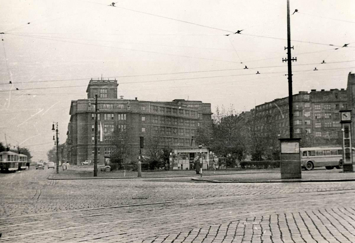 Předmostí Hlávkova mostu v 50. letech. Nalevo vidíme dvojici tramvají Tatra TI, která směřuje po nábřeží Kpt. Jaroše, tj. po té části trati, která byla zrušena v souvislosti s výstavbou Severojižní magistrály. Autobus Škoda 706 RO přijíždí po Bubenské třídě, koleje v popředí jsou propojkou mezi tratí na Bubenské ul. a na Bubenském nábřeží (od Holešovické tržnice). (zdroj: Vyšehradskej.cz)