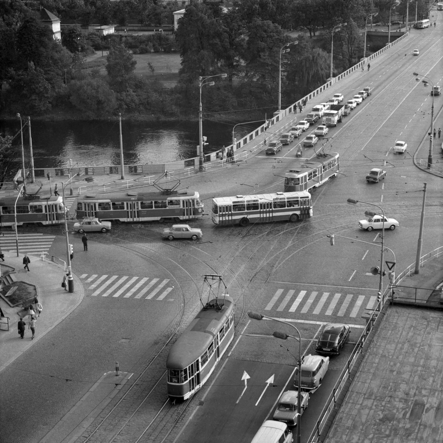 Krásný snímek ze 70. let pořízený z budovy Elektrických podniků ukazuje rušný provoz na předmostí Hlávkova mostu. Z Bubenské ulice přijela tramvaj T1 na lince č. 14. V průběhu let zde vznikla takřka úplná tramvajová křižovatka. (zdroj: Archiv hl. m. Prahy)
