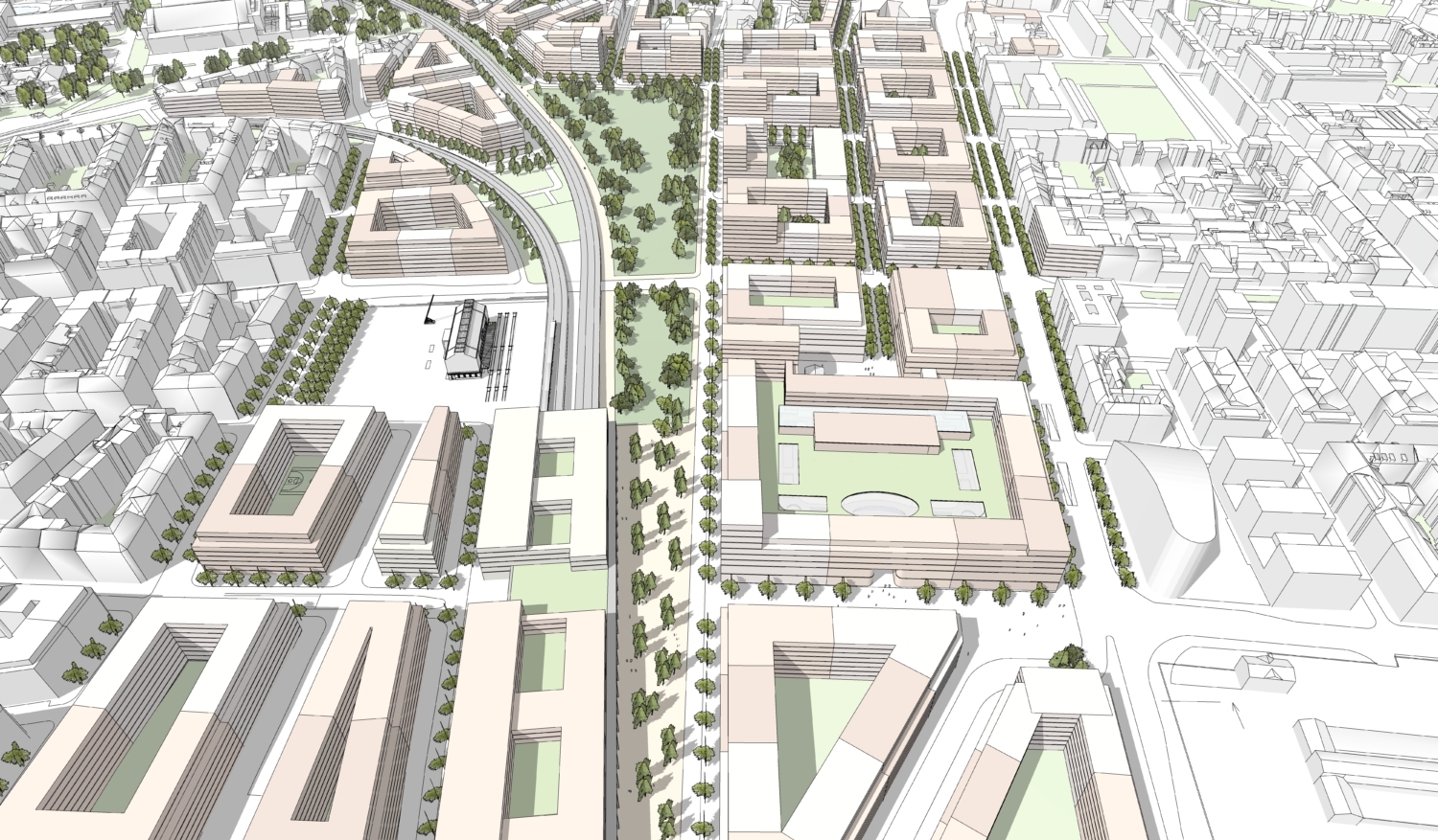 Návrh zástavby území Bubny-Zátory, Tramvajová trať by měla být vedena středovou komunikací. (zdroj: Územní studie Bubny-Zátory)