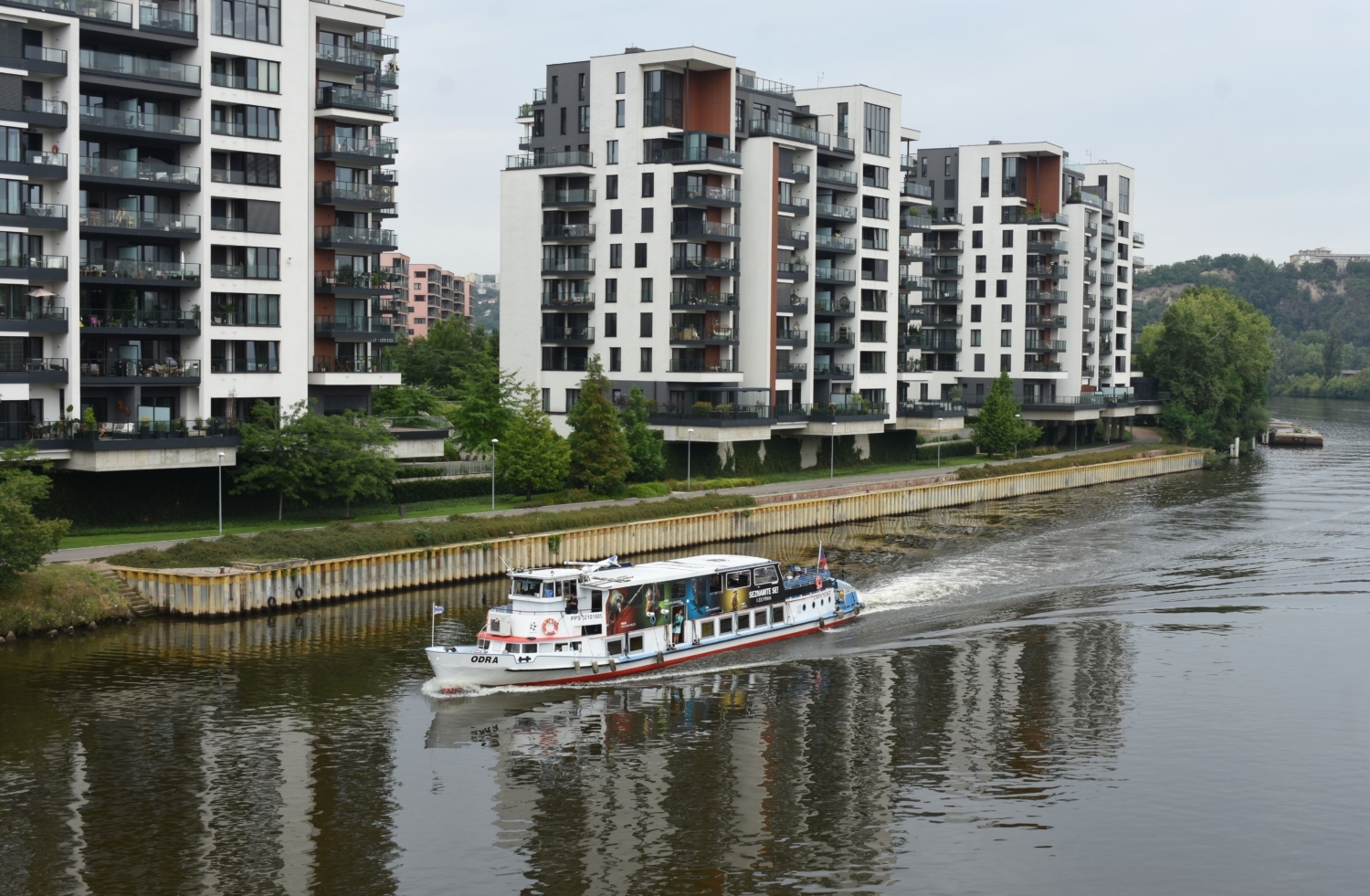 Loď Odra směřuje pod Libeňský most. Loď byla postavena v roce 1968 v Gdaňsku a jejím původním provozovatelem byl Dopravní podnik hl. m. Prahy. Dnes se využívá především pro cesty do Tróji k zoologické zahradě. Idea „vodní tramvaje“, která by spojovala nádraží Holešovice s oblastí u Hlávkova mostu, byla od doby vzniku studie již opuštěna. (foto: Libor Hinčica)