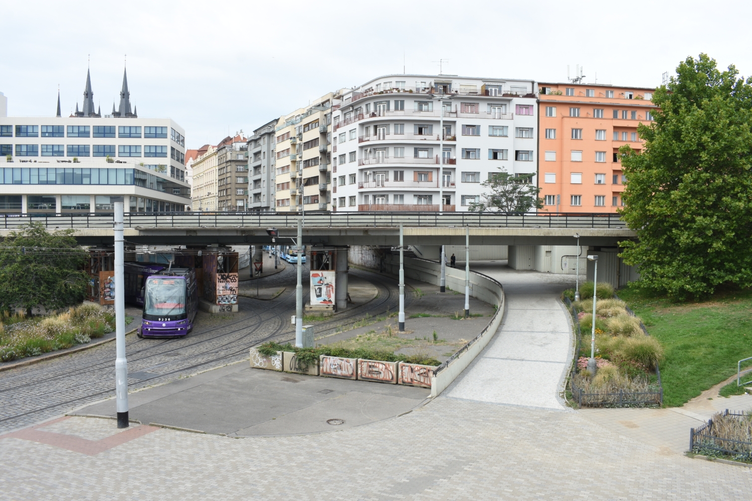 Pohled na most, pod nímž by měla podjíždět tramvaj. V místě je plánován kolejový trojúhelník. Směrem k fotografovi bude odbočovat větev napojující se do tratě na Bubenském nábřeží, na opačnou stranu by měla být vybudována trať skrze území určené k zástavbě. (foto: Libor Hinčica)