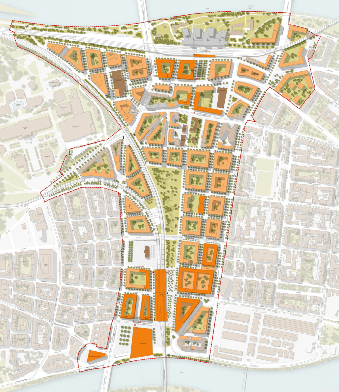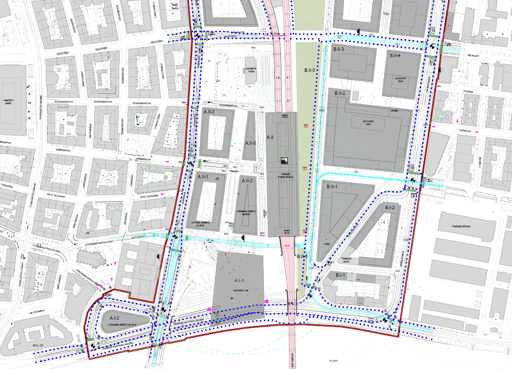 Kromě popisované přeložky se výhledově počítá s tím, že by se oblast kolem nádraží Bubny měla stát i lokalitou, v níž vznikne zcela nová tramvajová trať, resp. tratě. Ohlédneme-li se do historie, zjistíme, že již v roce 1991 byl brownfield v oblasti Holešovic-Bubnů označen za jednu z nejvýznamnějších rozvojových oblastí Prahy. Záhy začaly být připravovány první urbanistické studie, jež měly posloužit jako podklad pro změnu územního plánu, nicméně když v roce 1999 spatřil tento územní plán světlo světa, byla na oblast vyhlášena stavební uzávěra s tím, že je nutné před zahájením budování nové zástavby prověřit nejprve celkovou koncepci území. Pomineme-li studie z per developerů, byla podkladová studie zadána ateliéru CMC Architects až v roce 2012. Dokončena byla o dva roky později, avšak Praha 7, pod níž uvedená oblast spadá, vyjádřila s jejími závěry nesouhlas a prosazovala – nutno říct, že s ohledem na význam lokality zcela správně – vypracování návrhu na základě urbanistické soutěže. Ta byla připravena v roce 2017 pod taktovkou Institutu plánování a rozvoje (IPR), přičemž návrh nakonec do roku 2019 zpracovala společnost Pelčák a partner architekti v kooperaci s německým studiem Thomas Müller Ivan Reimann Architekten GmbH.