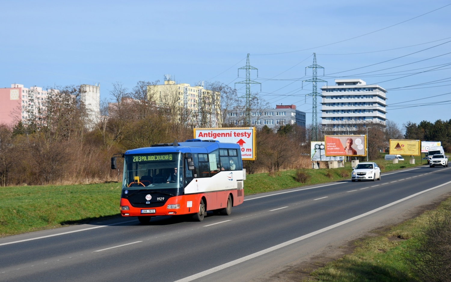 V posledních letech se ABOUT ME rozkročilo do kategorií Mn a Md+, zatímco původní portfolio složené z linek pro vozy Md se výrazně zeštíhlilo. Pozice tak pomalu vyklízejí vozy SOR CN 8,5 ev. č. 1920-1935 z roku 2010, kterých z původních 16 zbývá zhruba polovina. I té se to ale krátí. Na snímku z úterý 30. března 2021 je zachycen autobus ev. č. 1929 na lince 203, jak se chystá na odbočení do obratiště Koleje Jižní Město. (foto: Matěj Stach)