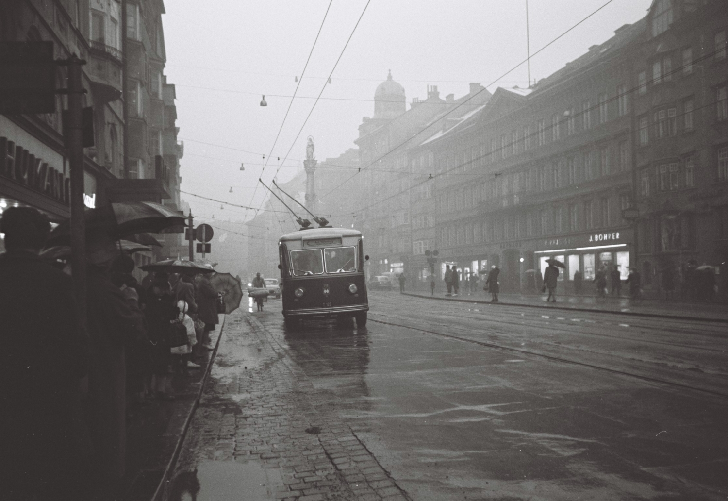 Trolejbusy v minulosti jezdily v Innsbrucku již dvakrát. První provoz byl spuštěn ve válečném roce 1944, během nějž se podařilo zprovoznit trojici linek. (zdroj: Stadtmuseum Innsbruck)