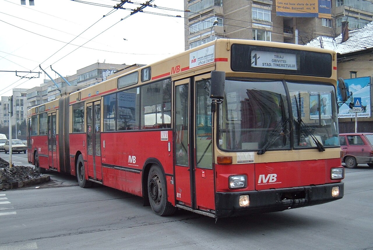 Vyřazené trolejbusy z Innsbrucku zamířily do ruské Vologdy, bulharské Sofie a rumunského Brašova. Právě z Brašova pochází snímek původně innsbruckého vozu Gräf & Stift GE 152 M 18 vyrobeného v roce 1988. (zdroj: Wikipedia.org; foto: Stefan Puscasu)