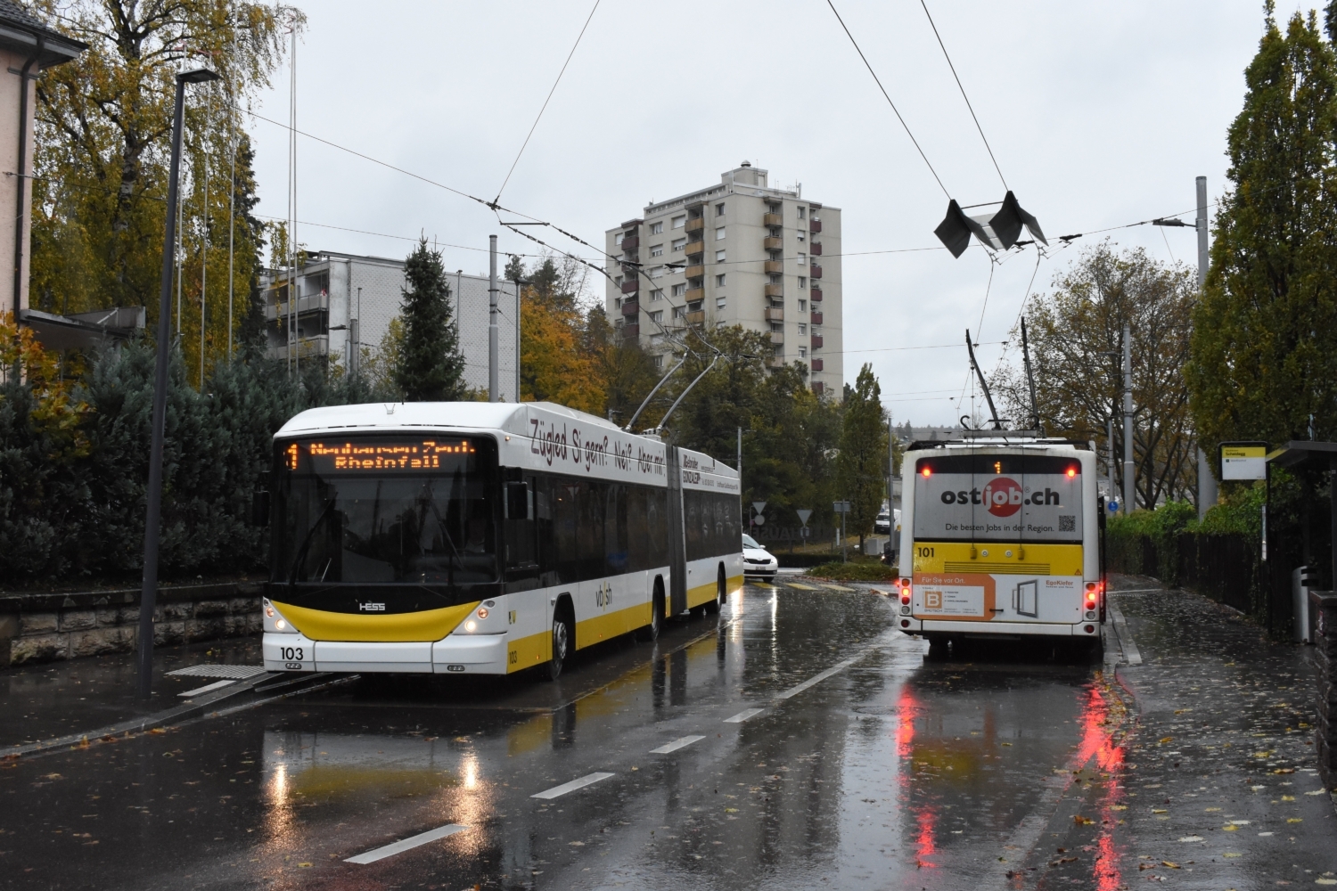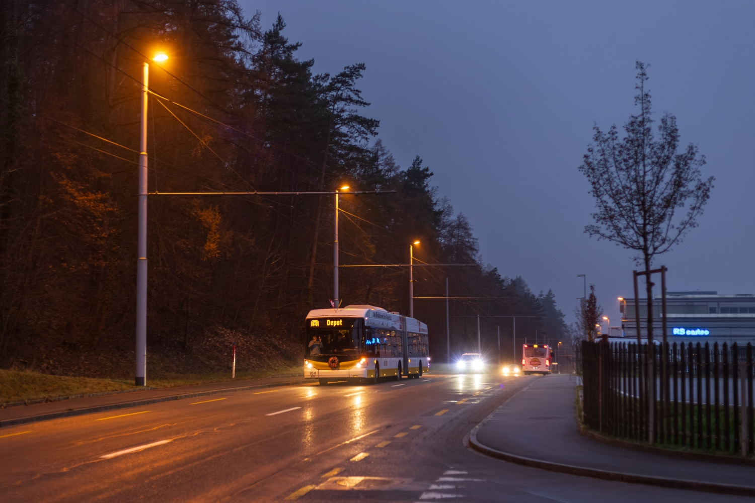 V případě trolejbusů bylo v rámci elektrifikační strategie rozhodnuto přistoupit k náhradě dieselových agregátů za trakční baterie s tím, že části stávající trasy linky č. 1 byly určeny ke snesení a trolejbusy je nově měly překonávat na baterie. V roce 2018 uvolnilo město na rekonstrukci sedmi vozů astronomickou částku 1 575 000 franků (takřka 41 mil. Kč), takže instalace baterií do jednoho vozu měla v přepočtu vyjít na nesmyslnou sumu 5,85 mil. Kč. Zakázka byla svěřena lokálnímu hegemonovi trhu – společnosti HESS, který pak do března 2020 požadovanou úpravu provedl. Následně pak došlo ke snesení dvou úseků (se zahájením prací 27. 4. 2020), a sice Scheidegg – Neuhausen Zentrum a Feuerwehrzentrum – Mühletor (tj. úsek okolo nádraží).