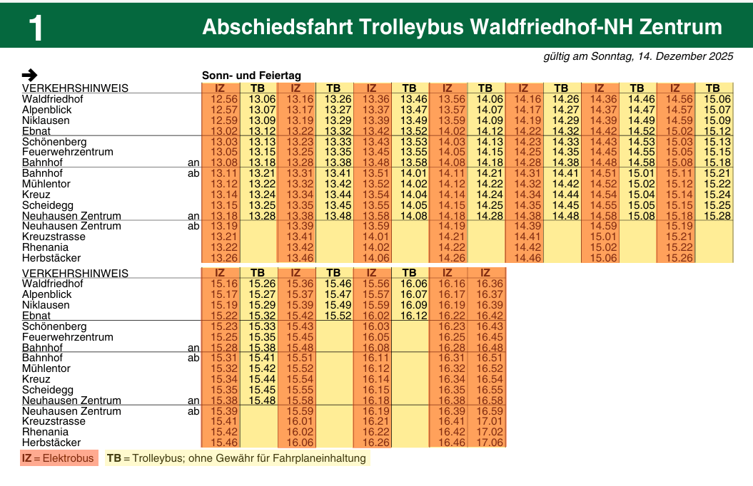 K omezení provozu trolejbusů došlo už od 1. 4. 2025, kdy přestaly obsluhovat úsek Neuhausen Zentrum – Herbstäcker (ono poslední prodloužení sítě z roku 1980) a náhradou za ně se staly dieselové autobusy. Podle pravidelného jízdního řádu vyjely trolejbusy naposledy 13. 12. 2025. V provozu ovšem byly už pouhé dva vozy (ev. č. 101 a 103), zbytek zůstal ve vozovně. Ostatně počet provozních trolejbusů se snižoval kontinuálně od počátku podzimu. Pakliže došlo k závadě, dopravce už neinvestoval do opravy a vypravil raději náhradní autobus, takže v prosinci už byly provozní jen čtyři vozy.