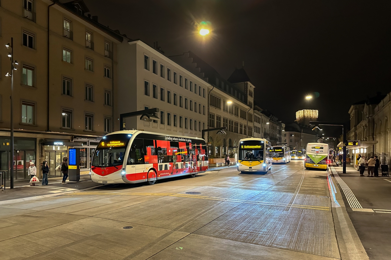 Trolejbusová trať byla v Neuhausenu v roce 2020 částečně snesena takže do jeho centra už bylo nutno pokračovat na baterie. (foto: Libor Hinčica)