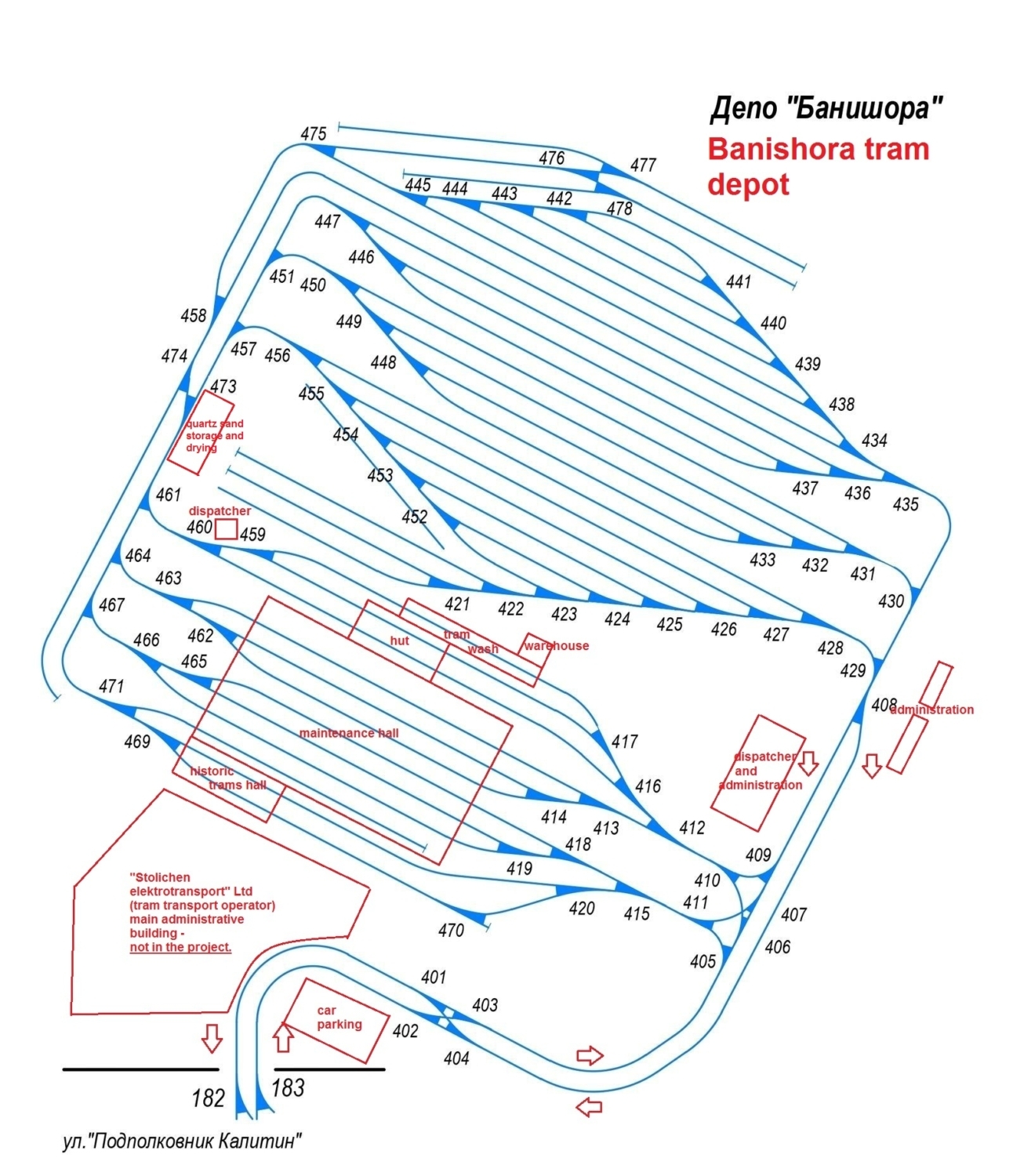 Ještě jeden pohled na vozovnu, tentokrát schematicky. Pro tramvaje by měla kromě údržbové haly vzniknout nově i hala krytá hala odstavná pro až 80 vozů + tramvaje historické. (zdroj: Stoličen Elektrotransport)