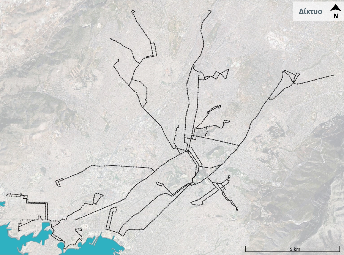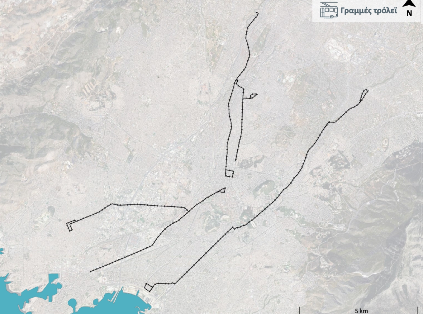 Před a po… Současný stav trolejbusové sítě (nahoře) se sítí ve městě Pireus v levé části a navrhovaný zbytkový systém po roce 2027… (zdroj: ΟΑΣΑ – ΟΣΥ)